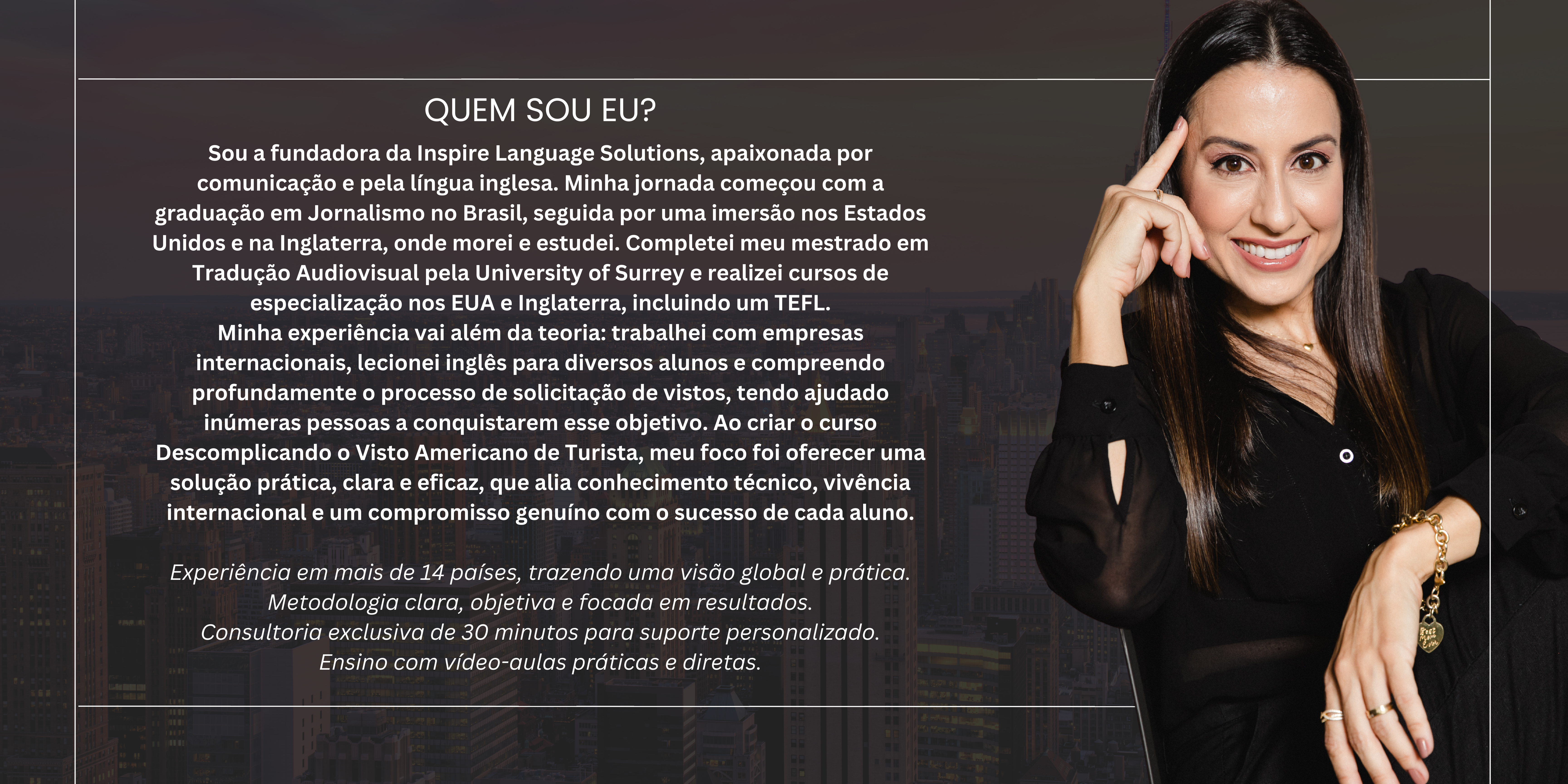 Minha experiência vai além da teoria: trabalhei com empresas internacionais, lecionei inglês para diversos alunos e compreendo profundamente o processo de solicitação de vistos, tendo ajudado inúmeras pessoas a conquistarem esse objetivo. Ao criar o curso Descomplicando o Visto Americano de Turista, meu foco foi oferecer uma solução prática, clara e eficaz, que alia conhecimento técnico, vivência internacional e um compromisso genuíno com o sucesso de cada aluno.
